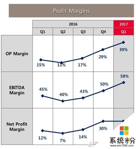 海力士在2017年Q1相对于2016年Q4的运营利率上涨了61%,毛利成长率为38%。